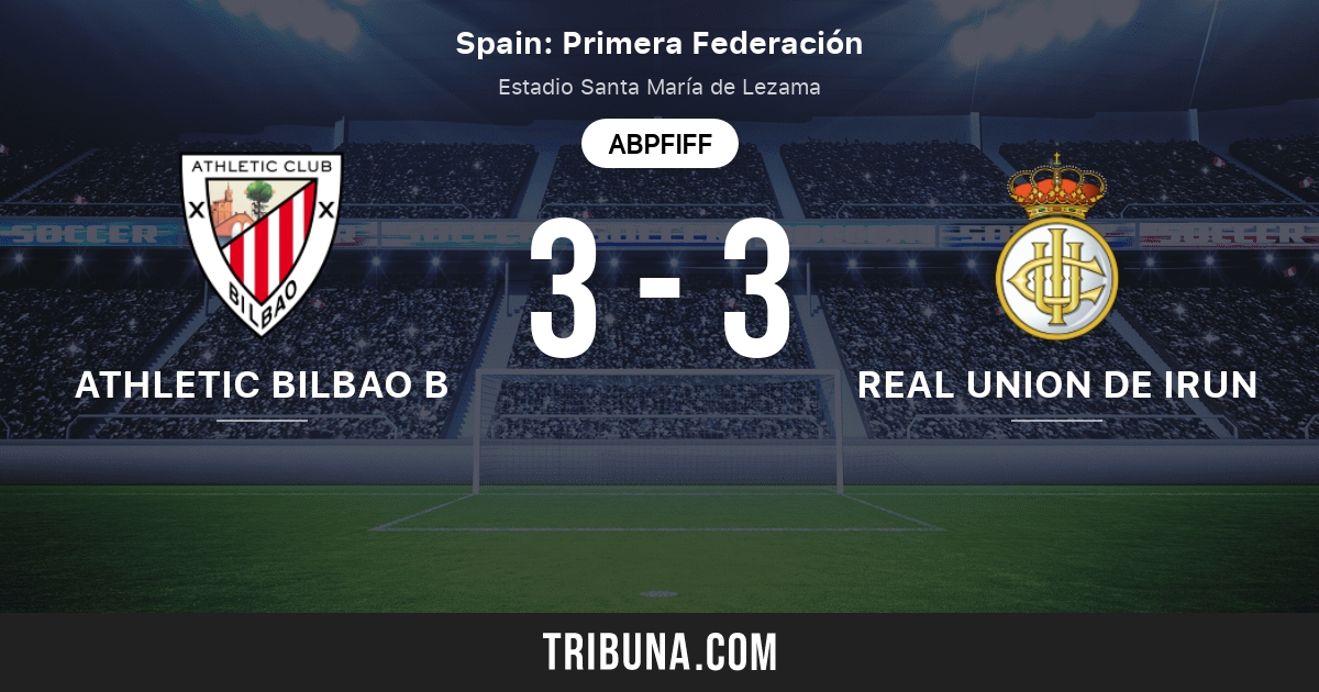 Real Union de Irun - Athletic Bilbao B Football Livescore Live Bet with the best odds Real Union de Irun - Athletic Bilbao B live score live betting live play-by-play and match result history. Gana 0-1 al Real Unión de Irún y se lleva los tres puntos Narrativa Super 2. Athletic Bilbao B in actual season average scored 140 goals per match. Real Unión Irún - Racing Santander 0711.